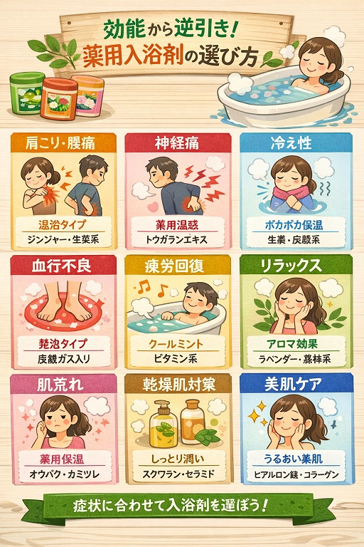 肩こりや腰痛には炭酸ガス系と無機塩類系の組み合わせ、冷え性には炭酸ガス系、疲労回復には生薬系がそれぞれ効果的です。体質や年齢に応じた選び方を意識し、38〜40℃のお湯で15〜20分の入浴を継続することで、日々の不調を和らげることができます。