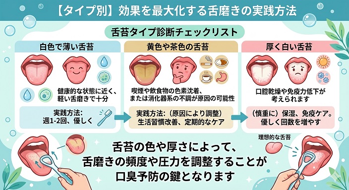 舌苔の色や厚さによって、舌磨きの頻度や圧力を調整することが口臭予防の鍵となります。